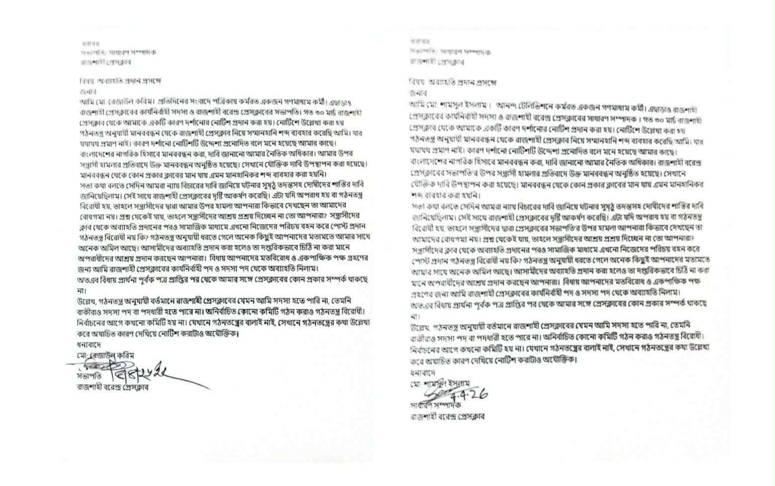 সেচ্ছায় রাজশাহী প্রেসক্লাব থেকে অব্যাহতি নিলেন রেজাউল ও শামসুল