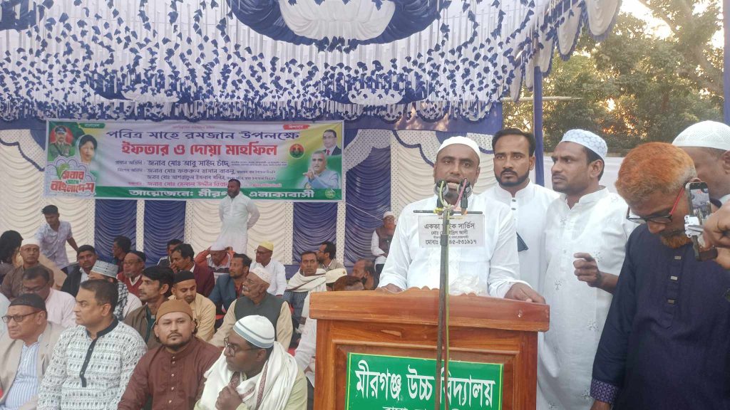 মনিগ্রাম ইউনিয়ন বিএনপির সভাপতি হেলাল উদ্দিন রিয়াল-এর সভাপতিত্বে অনুষ্ঠানটি পরিচালিত হয়। সহযোগিতা প্রদান করেন ইউনিয়ন বিএনপির সহ-সভাপতি তৈয়বূর রহমান তৈয়ব। মীরগঞ্জ এলাকাবাসীর আয়োজনে এই অনুষ্ঠানে স্থানীয় গণ্যমান্য ব্যক্তিবর্গ ও সর্বস্তরের সাধারণ মানুষ অংশ নেন। ইফতারের পূর্বে দেশ, জাতি এবং মুসলিম উম্মাহর শান্তি ও সমৃদ্ধি কামনা করে বিশেষ মোনাজাত করা হয়।