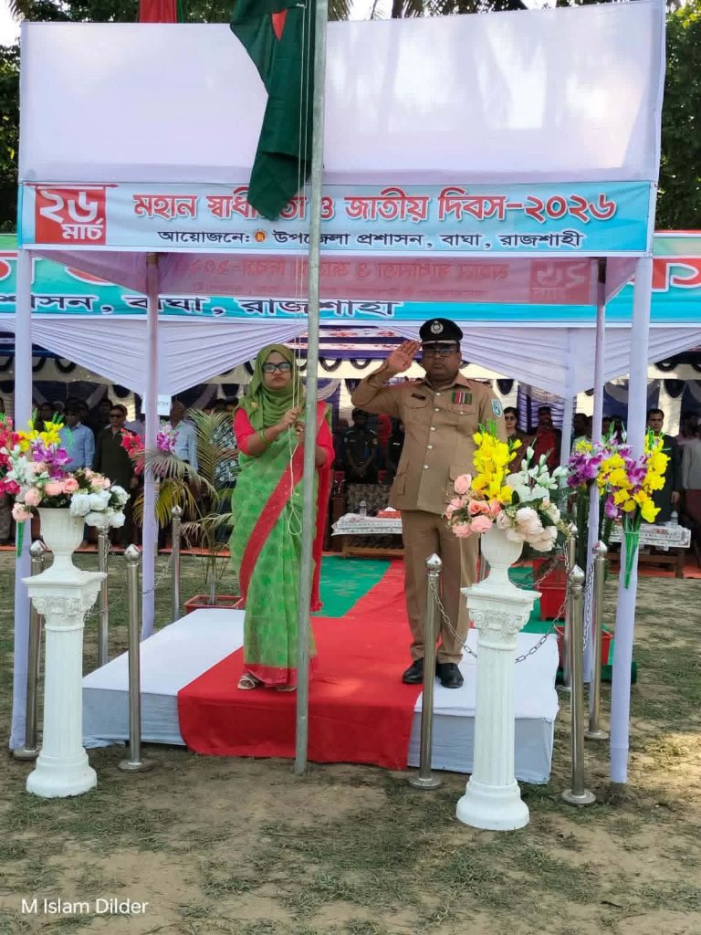 উপজেলার বাঘা শাহদৌলা সরকারি কলেজ মাঠে আনুষ্ঠানিকভাবে কোরআন তেলাওয়াত শেষে জাতীয় পতাকা উত্তোলন করেন উপজেলা নির্বাহী অফিসার শাম্মী আক্তার তমা। এ সময় তার পাশে অবস্থান করছিলেন বাঘা থানা অফিসার ইনচার্জ ওসি সেরাজুল হক। জাতীয় পতাকা উত্তোলন শেষে নির্বাহী অফিসার তার বক্তব্যে বলেন, আজকে সারা দেশব্যাপী যে দিনটি উদযাপন হচ্ছে এটি ধারে পাওয়া নয়। এই আমার ভাইয়ের রক্ত দিয়ে কেনা। ১৯৭১ সালে রক্তক্ষয়ী যুদ্ধের মধ্য দিয়ে এদেশের মুক্তিকামী জনতা পাক সেনাদের সাথে যুদ্ধ করে স্বাধীনতা ছিনিয়ে এনেছিল। আমরা আজকের দিনের অনেক ঘটনা হয়তো ভুলে যাব। কিন্তু দেশ স্বাধীনের জন্য রক্তক্ষয়ী যুদ্ধের কথা আমরা কোনদিনও ভুলতে পারবো না। তিনি যাদের রক্তের বিনিময়ে এ স্বাধীনতা অর্জিত হয়েছে তাদের আত্মার মাগফিরাত কামনায় সকলের জন্য দোয়া কামনা করেন।